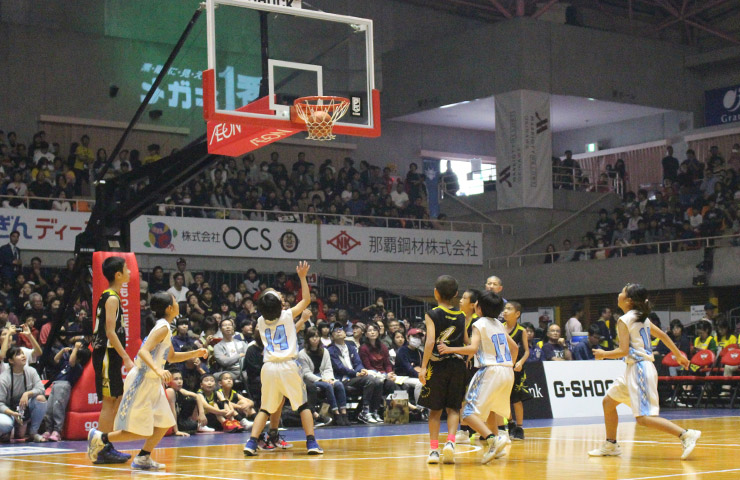 メガネ1番企画としてサインボール抽選会とハーフタイムには抽選で選ばれた 天願小学校 VS城東小学校チームによるドリームゲームも行われ、短い時間ながら激しい試合が行われました。